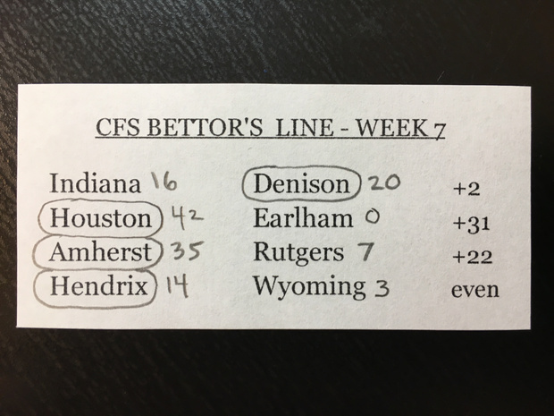 Earlham laid a big, fat egg this week, unable to cover even a 31 point spread against Houston. Denison snuck by Indiana. Hendrix outdueled Wyoming. Amherst defeated a Rutgers football team so incredulously bad that they only passed for eight yards in the entire game. One more time, Rutgers passed for eight yards. Put another way, miserable Earlham passed for 151 yards. Eight yards, everybody. Eight.