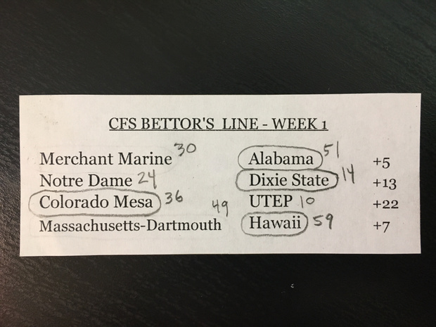 Alabama unfortunately chose self over country and took down Merchant Marine. Colorado Mesa edged out the Miners of UTEP. Lastly, the better Dartmouth was bested by Hawaii, the only Hawaii.