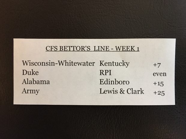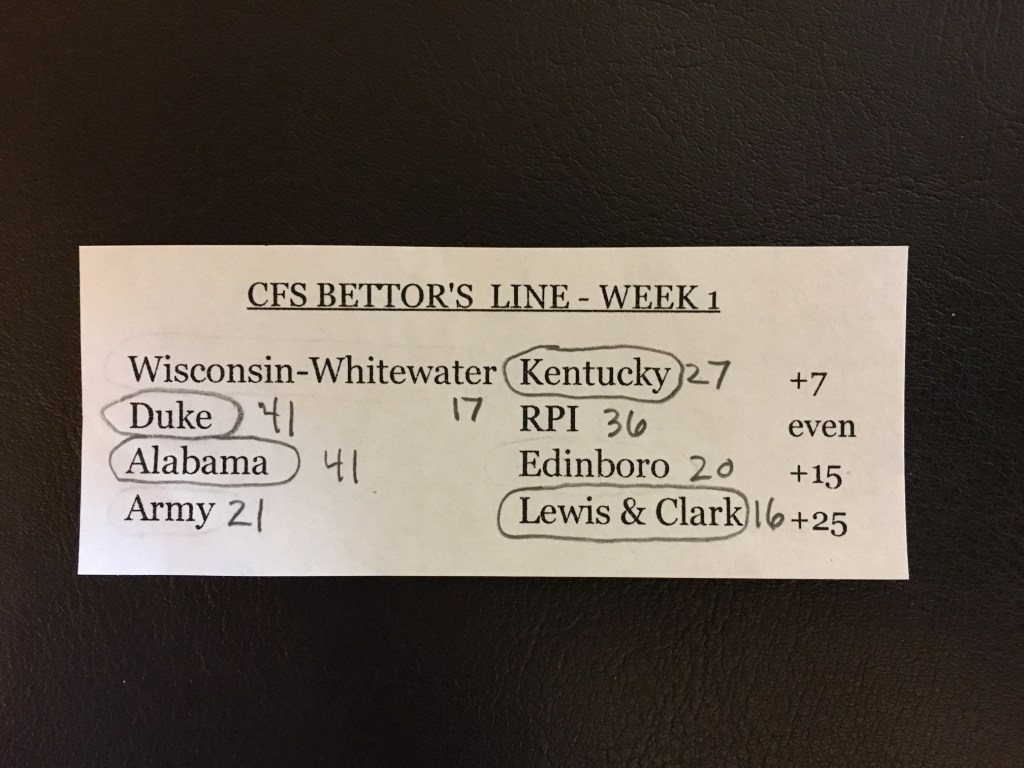 Here are the results from Week 1. I wrote in their real-life scores. Remember to add the spread to the second team (since they’re the weaker team on paper). The team that won their CFS game is circled.